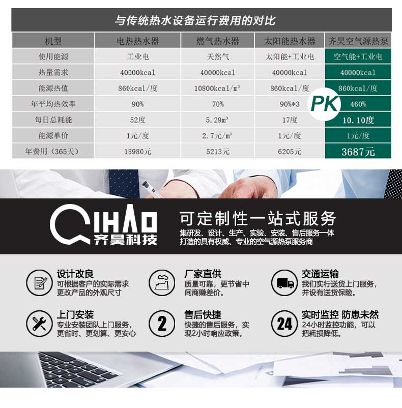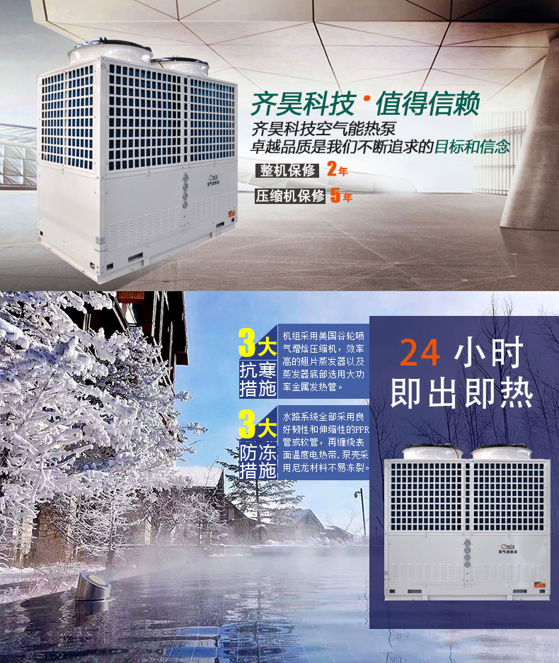 超低溫空氣源熱泵熱水係列機組,可實現24小(xiǎo)時恒溫(wēn)供水。齊(qí)昊超低溫空氣源熱泵熱水係列(liè)機組采用國際領先水平的噴氣(qì)增焓技術,確保了在低溫極寒(hán)的環境溫(wēn)度下機組也能穩定可靠的(de)運行。機組采用智能除霜技(jì)術(shù),化(huà)霜時間大大縮減,能效不衰減。機組零部件均采用國際一流品牌,安全可靠,使用壽命長達15年以上。