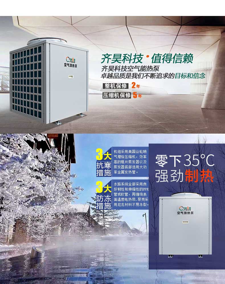 超低溫空氣源熱泵(bèng)冷暖係列(liè)機組,一台機器可同時實現製冷(lěng)、製熱與熱(rè)水(shuǐ),一機三(sān)用(yòng),綜合能效高。17c在线观看超(chāo)低溫空氣源熱泵冷(lěng)暖係列機組采用國際領先(xiān)水平的噴氣增焓技術,確保了在低溫極寒(hán)的環境溫度下機組也能穩定可靠的(de)運行。機(jī)組采用智能除霜技術,化霜(shuāng)時(shí)間大大縮減,能(néng)效不衰減。機組零部件均采用國際一流品牌,安全可靠,使用(yòng)壽命(mìng)長達15年以上。