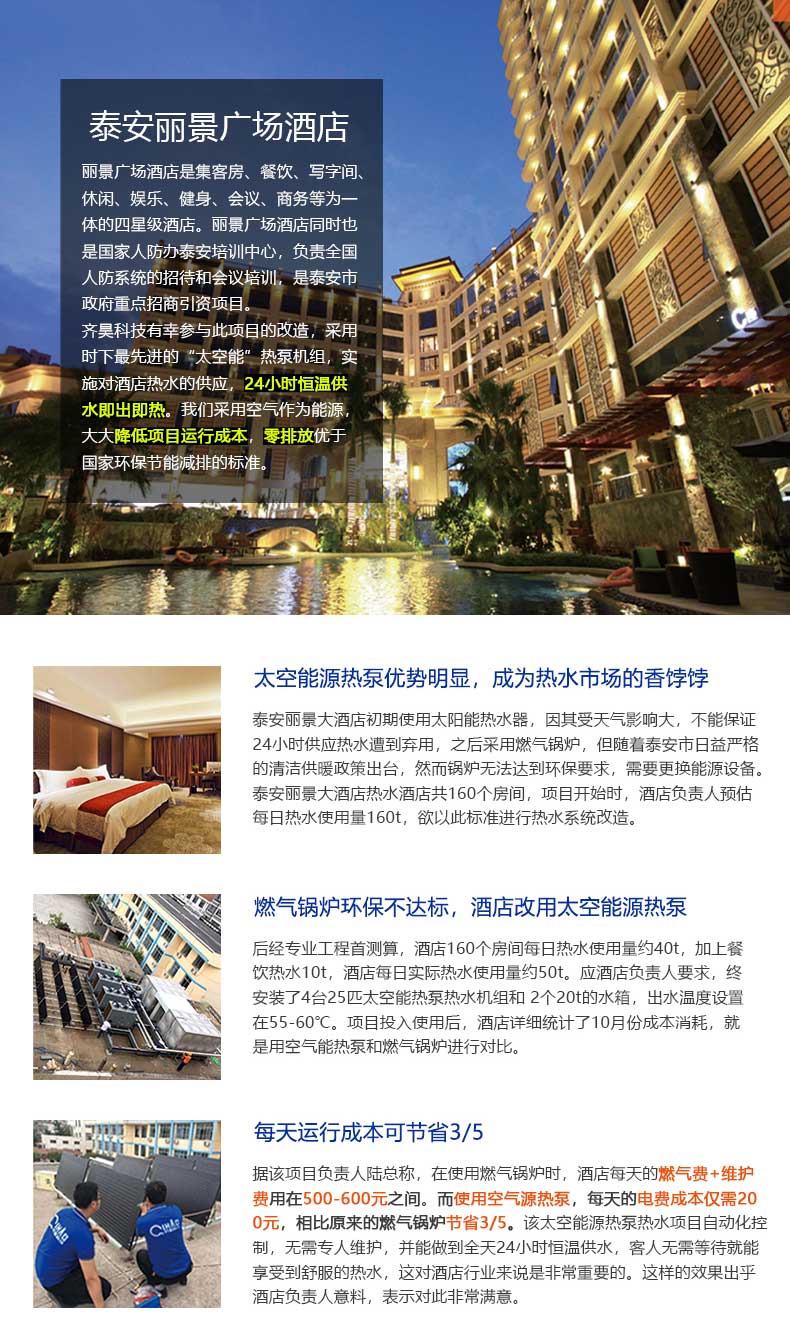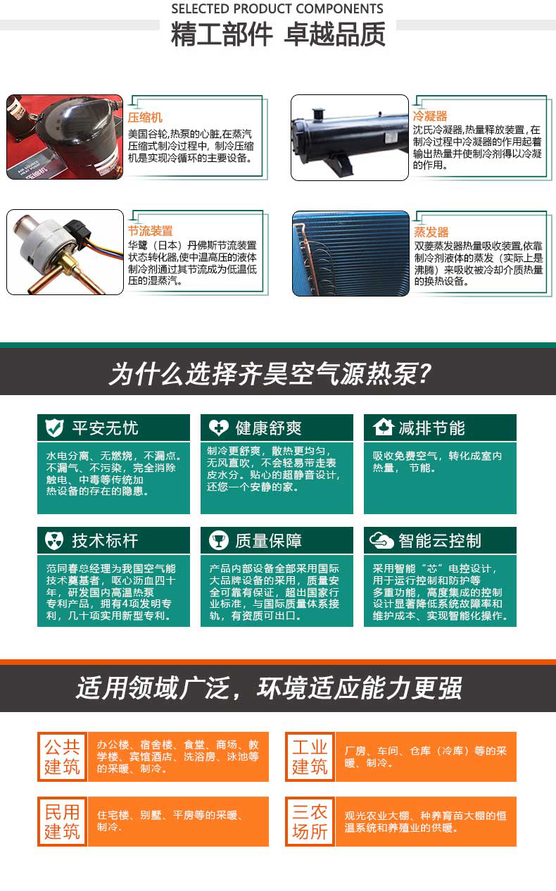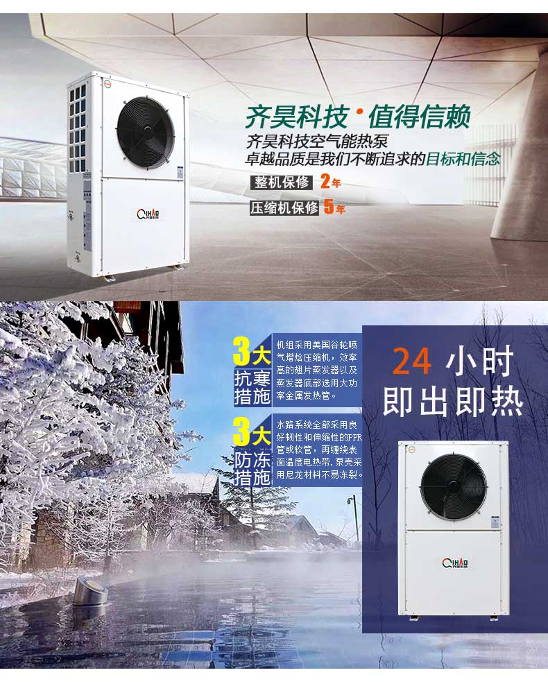 超低溫空氣源熱泵熱水係列機組,可實現24小時恒溫供水。齊(qí)昊超低(dī)溫空(kōng)氣源熱泵熱水係(xì)列(liè)機組采用國際領先水平的噴氣增焓技術,確保了在低溫極寒(hán)的環境溫度(dù)下機組也(yě)能穩定可靠的運行。機組采用智能除霜(shuāng)技(jì)術,化霜時間大大(dà)縮減,能效不衰減。機(jī)組零部件(jiàn)均采用(yòng)國際一流品牌,安全可(kě)靠,使用壽命長達15年(nián)以上(shàng)。